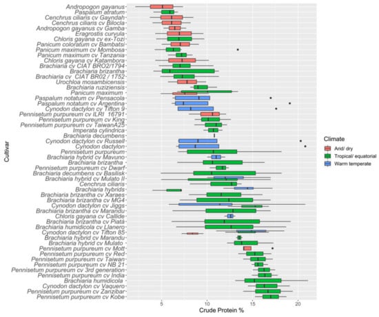 Ascending median values of crude protein (% DM) in tropical pasture species and cultivars grown in different environments.