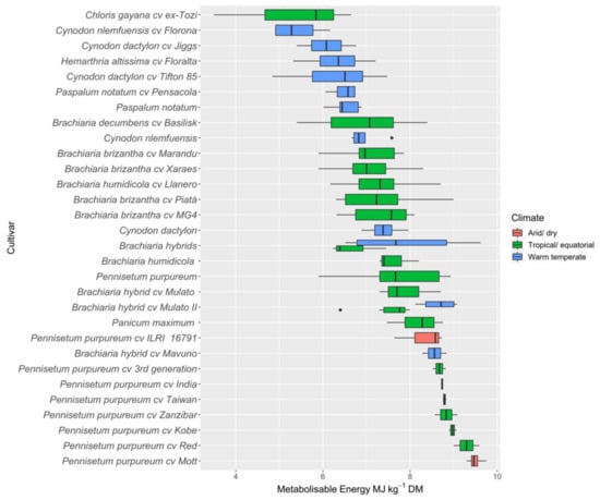 Ascending median values of metabolisable energy (MJ kg−1 DM) in tropical pasture species and cultivars grown in contrasting environments.