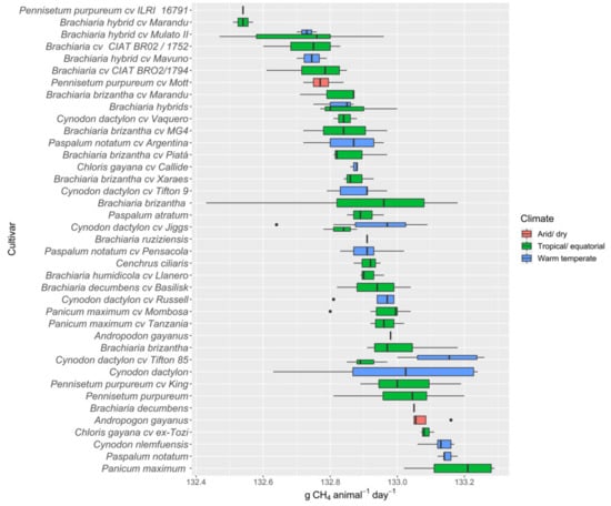 Ascending median values of estimated methane production (g CH4 animal−1 day−1) in tropical pasture species and cultivars grown in contrasting environments. Methane gas production was estimated using CH4 (g CH4 animal−1 day−1) = 17.0 (±0.99) × dry matter intake + 0.03 (±0.01) × neutral detergent fibre.