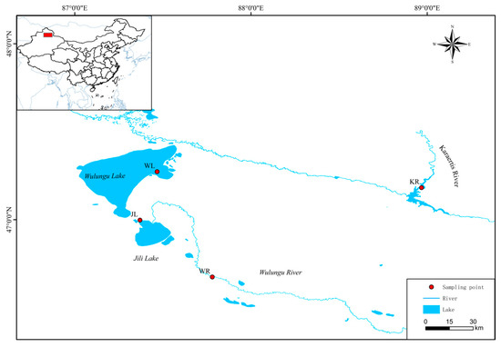 Sampling distribution of four P. fluviatilis populations. WL: Wulungu Lake; JL: Jili Lake; WR: Wulungu River; KR: Kalaeerqisi River.