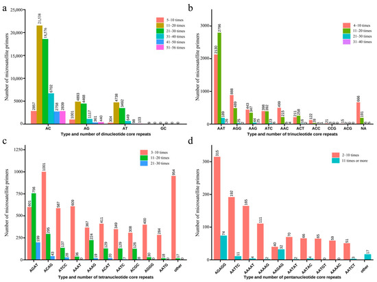 Distribution of microsatellite repeat motif types in the P. fluviatilis genome. Different colors represent the repeat times of different core sequences. (a) Type and number of dinucleotide core repeats. (b) Type and number of trinucleotide core repeats. (c) Type and number of tetranucleotide core repeats. (d) Type and number of pentanucleotide core repeats.