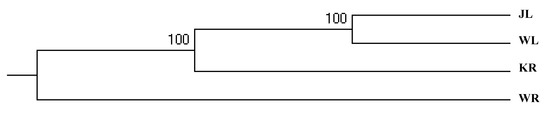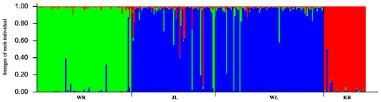 According to the results from Structure Harvester, K = 3 was the best value to cluster the four populations because the delta K value was the largest. The four populations could then be classified into three genetic components (Figure 4): the WR population constituted one group, the KR population constituted another group, and the WL and JL populations were clustered into one group.