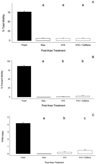 Barplot of (A) percent total motility, (B) percent forward motility, (C) FPM index of thawed sperm of the Louisiana pinesnake: not diluted (Raw), diluted in H10 (H10), or diluted in H10 with 10 mM caffeine (H10 + Caffeine). Bars represent the means and standard deviation for each experimental group. Kruskal–Wallis tests for significance followed by Dunn’s post-hoc test with the Benjamini–Hochberg correction for multiple comparisons to compare CPA treatments; alpha was set at 0.05. The letters represent significantly different groups, and the black filled bars represent fresh samples and were not included in the statistical tests.