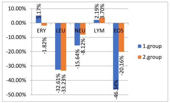 Percentage increase/decrease in averages of hematological indicators according to the analyzed groups after therapy. Legend: Ery, erythrocytes; Leu, leucocytes; Neu, neutrophils; Lym, lymphocytes; Eos, eosinophils; “1. group” is the group of dogs treated with acupuncture, phytotherapy and nutrition; “2. group” is the group of dogs treated with conventional Western medicine drug therapy.