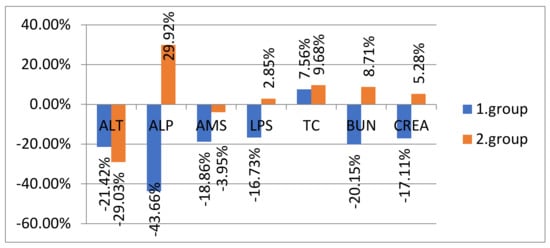 Figure 2 shows the percentage increase/decrease in the averages of biochemical indicators according to the analyzed groups after therapy compared to the condition before therapy. The most significant changes occurred with an increase of average values in the second group of dogs after therapy in the parameters ALP, LPS, TC, CREA, and BUN.