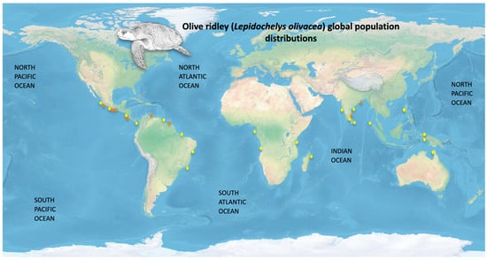 The olive ridley turtle is widely distributed throughout the tropical and subtropical waters of the Pacific, Atlantic, and Indian Oceans (Figure 1), predominantly in the Indo-Pacific region [29,30]. In the Pacific, this species has been reported from northern Mexico to Chile, including central Pacific islands [18,31,32,33], while in the Atlantic, there are reports of olive ridleys from the Azores Islands, in the North Atlantic, to Uruguay [34,35].