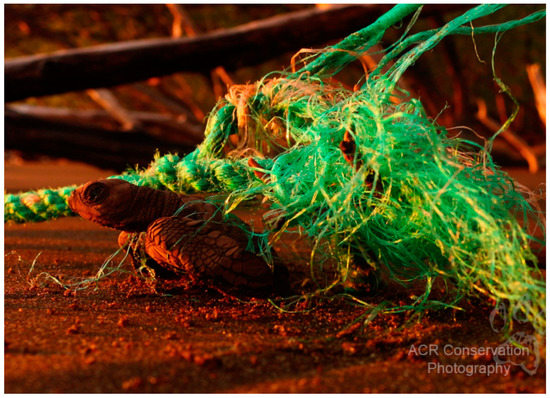 Olive ridley turtles may consume human-discarded marine waste such as fishing lines, balloons, plastic bags, floating tar or oil, and other objects that they mistake for food [95]. A floating plastic bag can resemble a jellyfish, algae, or other organisms that are common in sea turtle diets. In fact, loggerhead turtles ate plastic 17% of the time they came upon it, mistaking it for jellyfish. Green turtles, who are likely on the lookout for algae, increased this ratio to 62%. Marine debris has been identified in the stomachs of dead olive ridleys as well as in the nostrils of live olive ridley turtles in Costa Rica [121,122]. All sea turtle hatchlings and juveniles are particularly vulnerable to becoming entangled in rubbish in the oceans and on the beach, including old plastic robes, ‘six pack’ holders and discarded fishing gear (Figure 4).