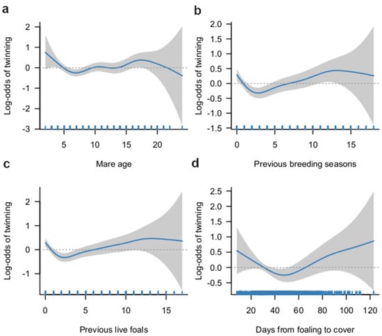 Graphical illustrations of the estimated relationships (‘the smooth’) between the log-odds of multiple pregnancies and: (a) age of the mares; (b) number of previous breeding seasons; (c) number of previous live foals; and (d) days from foaling to cover. The plots show fitted curves (blue lines) with 95% confidence intervals (the gray shading). Rug plots along the x-axes represent the number of data points. The dotted horizontal lines are at log-odds = 0.