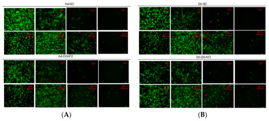 As shown in Figure 1, when the polybrene concentration was 5 μg/mL and the adenovirus dilution factor was 10−4 (MOI = 100), Ad-DGAT2, Ad-NC (A), sh-DGAT2, and sh-NC (B) adenovirus-infected cells had no lesions and a good morphology, and all expressed green fluorescence.