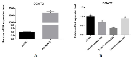 As shown in Figure 2, real-time PCR detected DGAT2 gene expression and found that in the culture containing Ad-DGAT2, the mRNA expression of DGAT2 was almost 1700-fold higher than that in culture containing Ad-NC (p < 0.01) (Figure 2A). Compared with the sh-NC control, DGAT2-shRNA-320 successfully mediated the interference of the DGAT2 gene in BSCs, and the interference efficiency reached 67.4% (Figure 2B). Therefore, the optimal MOI for subsequent experiments was determined to be 100.