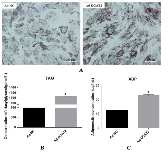 BSCs were infected with recombinant adenovirus expressing DGAT2 (Ad-DGAT2) and control (adenovirus containing green fluorescent protein; Ad-NC) for 24 h and then differentiated by treatment with OA for 96 h. Lipid droplet measurement and TAG and ADP analyses were performed. As shown in Figure 3A, lipid droplet accumulation was significantly induced in BSCs transfected with Ad-DGAT2 compared with that in BSCs transfected with Ad-NC. Relative to Ad-NC, the overexpression of DGAT2 significantly increased cellular TAG accumulation (Figure 3B), and the adiponectin content in the medium also significantly increased (p < 0.05; Figure 3C).