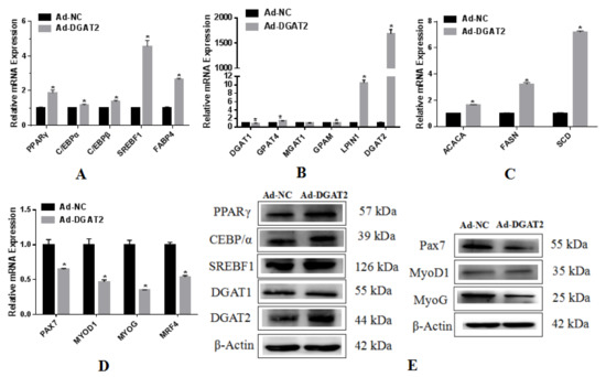 As shown in Figure 5A, compared to the control Ad-NC, the mRNA expression of PPARγ, C/EBPβ, SREBF1, and FABP4 was significantly upregulated in Ad-DGAT2-infected cells, and the expression of C/EBPα was also significantly upregulated (p < 0.05). Compared with Ad-NC, overexpression of DGAT2 significantly upregulated the expression of the triacylglycerol synthesis-related genes GPAT4 and LPIN1, as well as DGAT1 and GPAM (p < 0.05) (Figure 5B). Compared to the Ad-NC control, overexpression of DGAT2 significantly upregulated the mRNA expression of ACACA, FASN, and SCD (p < 0.05; Figure 5C). As shown in Figure 5D, the overexpression of DGAT2 significantly suppressed the expression of PAX7, MYOD1, MYOG, and MYR4 in BSCs (p < 0.05). The expression levels of these proteins are shown in Figure 5E (Figure S1).