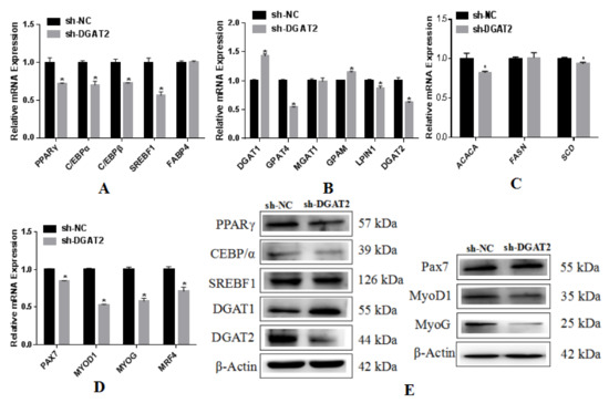 Interference with the expression of DGAT2 inhibits the expression of genes related to adipogenesis and lipid metabolism in BSCs. mRNA expression levels of genes associated with (A) lipogenesis, (B) triglyceride synthesis, and (C) fatty acid synthesis in BSCs. (D) Interference with DGAT2 downregulates myogenesis-related gene expression in BSC. Values are presented as means ± SEM from three individual cultures. * p < 0.05. (E) Protein levels of adipogenesis markers PPARγ, SREBF1, C/EBPα, DGAT2, and DGAT1, and myogenesis markers Pax7, MyoD1, and MyoG.