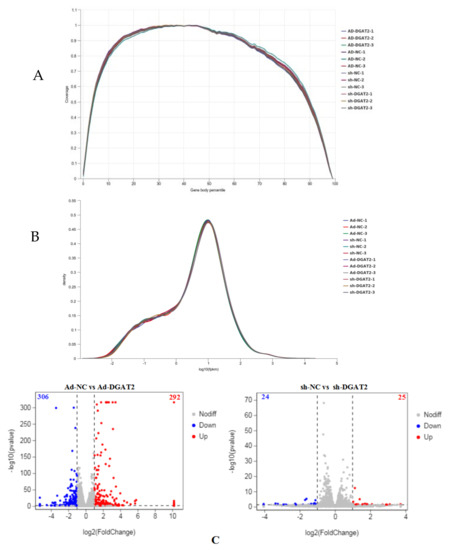 Screening of differentially expressed genes (DEGs) in BSCs infected with Ad-DGAT2/sh-DGAT2. BSCs were infected with Ad-NC, Ad-DGAT2, sh-NC, or sh-DGAT2 for 24 h; differentiation was induced with OA treatment for 96 h; and total RNA was extracted for transcription and sequencing analysis. (A) Gene coverage uniformity. (B) FPKM density distribution. (C) Volcano plot of DEGs.