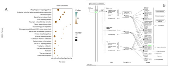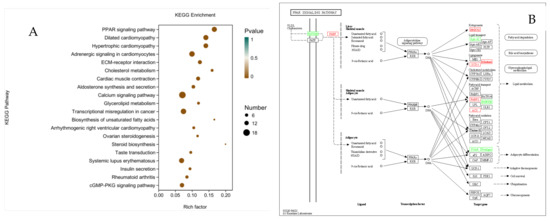 KEGG enrichment analysis of differentially expressed genes (DEGs) after interference of DGAT2. (A) KEGG enrichment factor map. (B) KEGG functional annotation of DEGs involved in the PPAR signaling pathway. Green rectangles indicate that DEGs were significantly downregulated (log fold change > 1, FDR < 0.001) in BSCs infected with sh-DGAT2 compared to control sh-NC.