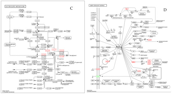 KEGG enrichment analysis of differentially expressed genes (DEGs) after overexpression of DGAT2. (A) KEGG enrichment factor map. (B) KEGG functional annotation of DEGs involved in the PPAR signaling pathway. (C) KEGG functional annotation of DEGs involved in the glycerophospholipid metabolic pathway. (D) KEGG functional annotation of DEGs involved in the biosynthetic pathway of unsaturated fatty acids. Red rectangles indicate DEGs significantly upregulated (log fold change > 1, false discovery rate (FDR) < 0.001); green rectangles indicate DEGs significantly downregulated (log fold change > 1, FDR < 0.001) in BSCs infected with Ad-DGAT2 compared with control Ad-NC.