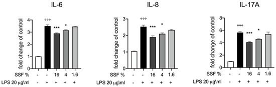 Effect of SSF on IL-6, IL-8 and IL-17A expression. ELISA quantification of IL-6, IL 8, IL-17A after LPS intoxication and lSSF treatment. SSF was efficient at notably reducing IL-6, IL 8, IL-17A. Data representative of at least three experiments,°°° p < 0.001 versus CTR; * p < 0.05 versus LPS; *** p < 0.001 versus LPS.