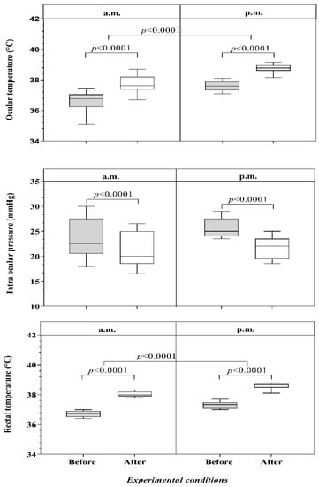 IOP, OT and RT in particular have been monitored during both the a.m. and p.m. hours as this reflects the impact of endogenous circadian rhythms, in addition to workload conditions or environmental changes. Knowledge about time-of-day effects on the physiological responses to exercise in horses can have important implications on the planning of training schedules, working habits and competitions. The aim of the present study was to investigate the possible responses of some ocular physiological variables (OT and IOP) to physical exercise in show jumping horses during the morning (a.m.) and afternoon (p.m.) periods in correlation with rectal temperature.