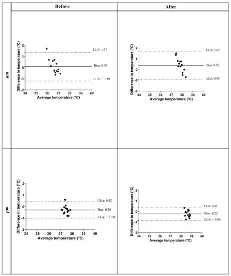 We observed agreement in the results between RT and OT, as shown showed in B-A plots at each time point of the monitoring period (a.m. before exercise; a.m. after exercise; p.m. before exercise and p.m. after exercise). Particularly, an agreement between the values of RT and OT was found as the data fell within the upper and lower limits of agreement, as shown in Figure 2. The B-A test was used to plot the agreement in ocular and rectal temperatures. For OT and RT recorded during a.m. hours before exercise, the greater bias was 0.08 °C, with limits of agreement (LOAs) showing that the discrepancy between OT and RT for an individual animal ranged from −1.19 to 1.37. For OT and RT recorded during the a.m. hours after exercise, the bias was 0.35 °C, with LOAs ranging from 0.94 to 1.65; on p.m. hours before exercise, the bias was −0.28 °C, with LOAs ranging from −1.00 to 0.42 and for p.m. hours after exercise the bias was −0.22 °C, with LOAs ranging from −0.86 to 0.41.