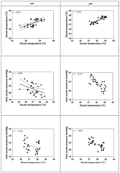 Therefore, our results demonstrated an association between increased body temperatures and IOP variations during exercise [33]. OT has been observed to be significantly related to rectal temperature, confirming that both measurements may be carried out to detect hyperthermic changes during physical exercise in horses [27,34].