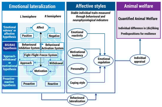 Framework for affective style measurement driven animal welfare research: Relationship between the farm animal emotional lateralization, animal welfare and the affective states. Lateralization: Asymmetrical representation of the control of emotions and processing in the animal brain. BIS—behavioural inhibition system; BAS—behavioural activation system. BIS—Behavioural Inhibition System; BAS—Behavioural Activation System. Reprinted from [44] Applied Animal Behaviour Science 237, 105279, Goursot, C.; Düpjan, S.; Puppe, B.; Leliveld, L. M. Affective styles and emotional lateralization: A promising framework for animal welfare research, 2021, Creative Commons Attribution (CC BY 4.0). https://doi.org/10.1016/j.applanim.2021.105279 (accessed on 2 October 2021). Text in the right hand box was changed from “Individualized welfare” to “Quantified Animal Welfare”.