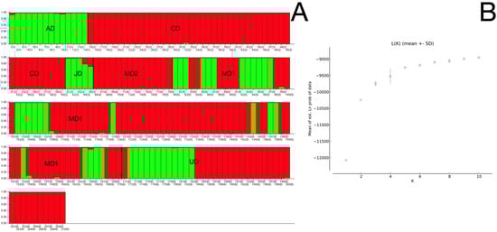 - Pritchard, J.K.; Stephens, M.; Donnelly, P. Inference of population structure using multilocus genotype data. Genetics 2000, 155, 945–959. [Google Scholar] [CrossRef] [PubMed]