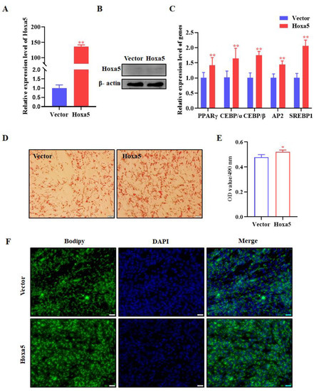 3.2. Hoxa5 Promotes Adipogenic Differentiation of Goat Subcutaneous Preadipocytes
