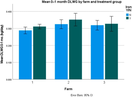 Data were entered into Excel (Microsoft) spreadsheets and analysed in SPSS (IBM SPSS Statistics Version 28.0.0). Data were presented as mean, standard deviation (SD), or the confidence interval (CI), as appropriate. Two-sample independent t-tests were performed to compare 0–1 months, 1–2 months, and 0–2 months DLWG and haemoglobin levels and differences at one month of age. Treatment data and mortality figures were also compared, and tests were chosen where appropriate according to the effect size (chi-squared or Fisher’s exact test).