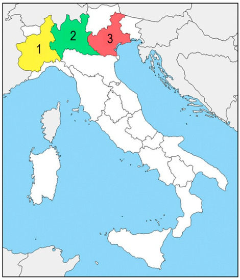 Geographic localization of the zoological facilities from Northern Italy included in this study. 1: Zoological facility from Piedmont; 2: zoological facility from Lombardy; 3: zoological facility from Veneto.