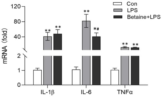 qRT-PCR quantification of the mRNA expressions of pro-inflammatory cytokines. Newly hatched broilers were provided with water supplemented with betaine at a dose of 1000 mg/L. At the age of two weeks, the broilers were intraperitoneally injected with LPS at a dose of 1 mg/kg BW. Two hours after the LPS treatment, leg muscle was collected, and the relative mRNA expressions of IL-1β, IL-6, and TNFα were determined using qRT-PCR. The treatment and method are the same for Figure 2 and Figure 3. Values are mean ± SEM, n = 6/group. Significance levels: * p < 0.05, ** p < 0.01 vs. control, # p < 0.05 vs. LPS.
