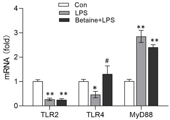 As shown in Figure 2, the intraperitoneal injection of LPS decreased the mRNA expression of TLR4 (p < 0.05) and TLR2 (p < 0.01) but stimulated the mRNA expression of myeloid differentiation factor 88 (MyD88) (p < 0.01) in the broiler leg muscle. In contrast, the mRNA expression of TLR4 in the leg muscle of chickens that consumed betaine was considerably increased compared with that of the LPS group (p < 0.05), and it was comparable with that of the control group. However, betaine did not inhibit the effects of LPS on TLR2 and MyD88 mRNA expression.