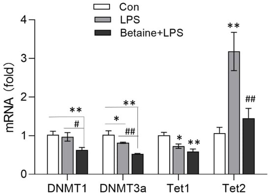 The effects of LPS on the mRNA expression of DNA methylation-associated enzymes were analyzed. As shown in Figure 3, LPS significantly decreased the mRNA expression of DNA methyltransferase 3a (DNMT3a) (p < 0.05) and Tet1 (p < 0.05) and increased the expression of Tet2 (p < 0.01). In contrast, betaine inhibited LPS-induced Tet2 expression but did not inhibit the effect of LPS on the expression of DNMT3a and Tet1.