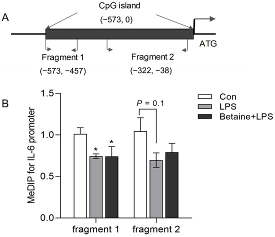 Two CpG islands were founded along 2000 bp in the 5′ flanking region of the IL-6 gene. The MeDIP-qPCR test showed that LPS significantly decreased the 5 mC level in the IL-6 promoter; however, betaine did not interfere with this effect (Figure 4).