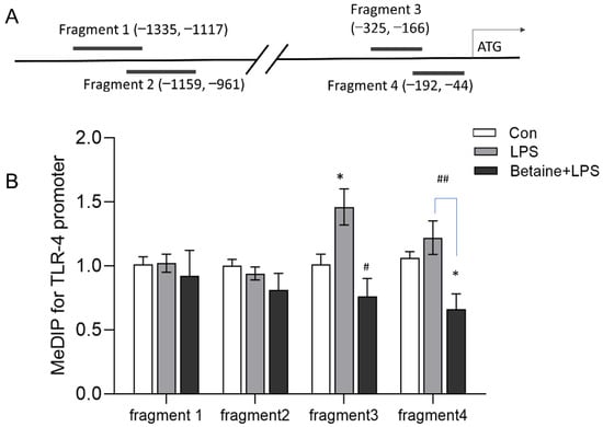 Schematic structure of the chicken TLR4 gene promoter and the methylation status. (A) The schematic structure of the chicken TLR4 promoter. Fragments 1-4 were regions detected by MeDIP-PCR. (B) The methylation levels of fragments 1–4. Values are mean ± SEM, n = 4/group. Significance levels: * p < 0.05 vs. control, # p < 0.05, ## p < 0.01 vs. LPS.
