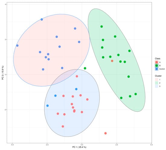 The distribution of metals in blood, and oxidative stress levels in the serum of cows were investigated using a principal component analysis (PCA). The PCA results (Figure 1) showed a clear separation between the control (C), and polluted areas (farms A and B). This could be attributed to the differences in heavy metal stress in the cows in the different areas.