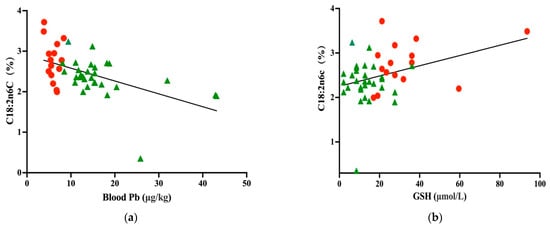 Relationship between the C18:2n6c content in milk and (a) the blood Pb concentration and (b) serum GSH level.