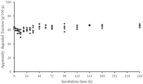 Taking proper information at the end of the degradation process is critical to accurately estimate the extension of degradation []. In this sense, using very short times may lead to the overestimation of undegradable fraction. Feeds produced under tropical and non-tropical conditions are likely to differ in terms of ruminal degradation dynamics []. This difference seems to support the need for longer incubations periods for the feeds produced in the tropics.
