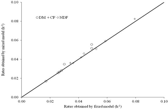 For all the degradation profiles studied, except for CP from soybean hulls, we obtained adjustments with estimates of variance among animals on the degradation rate numerically greater than zero (Table 3). However, in spite of the peculiarities associated with each modelling approach, there were no differences (p ≥ 0.34) in the degradation rates estimates obtained by the fixed or mixed models (Figure 2). This pattern seems to be logical, as the mathematical expectations of the parameters are the same for both approaches [,].