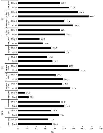 Pattern of the Akaike information criterion (AIC) for the adjusted degradation of dry matter (DM), crude protein (CP), and neutral detergent fiber (NDF) for different feeds by using the fixed or mixed non-linear modelling approaches.