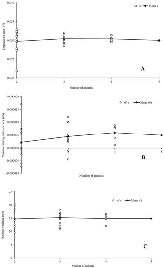 Variability of the estimates of degradation rate of the potentially degradable insoluble fraction of the dry matter (k), (A), random variance among animals on k (σ2a), (B), and residual variance (σ2ε), (C) for the dry matter degradation profile of cottonseed meal according to the number of animals used in the in situ trial.