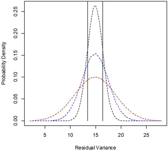 Example of probability distribution according to the central limit theorem for the residual variance of cottonseed meal DM degradation according to the number of animals used in the in situ trial [dashed lines: black = 4 animals; blue = 3 animals; red = 2 animals; the vertical lines delimit the region for p (0.9 × σ2Ԑ < σ2Ԑ < 1.1 × σ2Ԑ)].