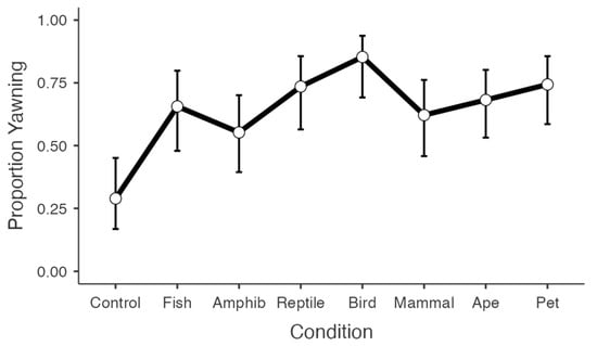 Previous studies have shown that humans have a biased perception of other animals based on phylogenic relatedness, which may be predictive of yawn contagion. For example, people tend to demonstrate both higher subjective self-report and psychophysiological measures of empathy towards species with greater phylogenetic proximity to humans [58]. Research has also shown that the perceived communicative and empathic ability of a given animal is positively correlated with the phylogenetic relatedness to humans [59]. Similarly, in a large sample of participants in the United States, Callahan et al. [60] revealed that mammals were ranked highest among traits characterized as cognitive and emotive, followed by birds, reptiles, amphibians, and then fish. Based on this literature, and the proposed connections between yawn contagion and empathy or emotional contagion [61,62], we predicted that interspecific contagious yawning in humans would be higher in response to species that were more closely related (apes > non-primate mammals > reptiles and birds > amphibians > fish).