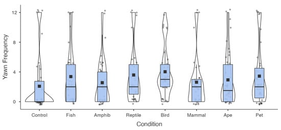 The complete distribution of yawning frequency revealed eight outliers, as defined by 1.5 times the interquartile range. In each case, participants reported more than 12 contagious yawns during the stimulus evaluation (which took ~1 min to complete in pretesting), or greater than 1 yawn per stimulus pairing. After excluding these participants from the analysis, the final sample was 296 (control N = 38; fish N = 32; amphibians N = 38; reptiles N = 34; birds N = 34; non-primate mammals N = 37; apes N = 44; pets N = 39). A post hoc power analysis was performed using G*Power 3.1 with a medium-sized effect [75], revealing a power of 0.977 and 0.903 to detect a main effect across conditions for the binary and frequency measures of yawning, respectively. This was considered a conservative prediction given that prior work on humans has shown familiarity and social closeness to have large effects on contagious yawning [64,65].