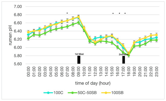 The effects of replacing ground corn with sugar beet root on the daily variations in the rumen pH of early-lactating dairy cows. * Significant differences (p < 0.05) among dietary treatments. Error bars denote standard error of the mean; 100C, control diet with ground corn as energy supplement; 50C-SB, diet with 50% ground corn and 50% sugar beets as energy supplements; 100SB, diet with 100% sugar beet as energy supplement.