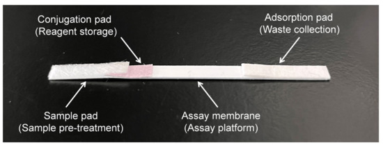 A sample in 80 μL was dropped onto the sample pad. It passed through the NC membrane and, a result, showed up in 10 min. Both the test and control zones showing red lines indicated a positive result, whereas only the control zone appearing as red denoted a negative result. A single red line in the test zone or no red line at all on the strip indicated an invalid test.