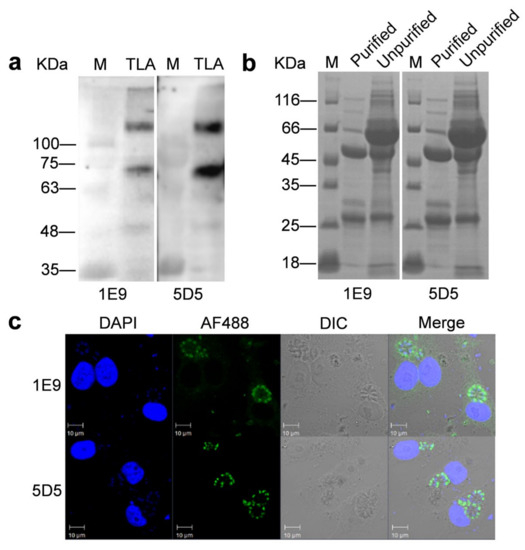 Identification of TgROP14-5D5 mAb and TgROP14-1E9 mAb. (a) Western blot analysis of two mAbs reacted with T. gondii lysate antigen (TLA). Total soluble proteins of T. gondii tachyzoites (10 μg) were loaded into each lane. The primary antibodies were mAb 1E9 and 5D5 to TgROP14. M: protein marker. (b) SDS-PAGE analysis of two mAbs before and after purification. Left: 1E9 mAb after purification and before purification; right: 5D5 mAb after purification and before purification; M: protein marker. (c) IFAT of two mAbs. Vero cells were used after infection with T. gondii tachyzoites for 24 h. The primary antibodies and Alexa Fluor 488-conjugated secondary antibodies for labeling were used in 1:1000 dilution. Confocal micrographs are shown.