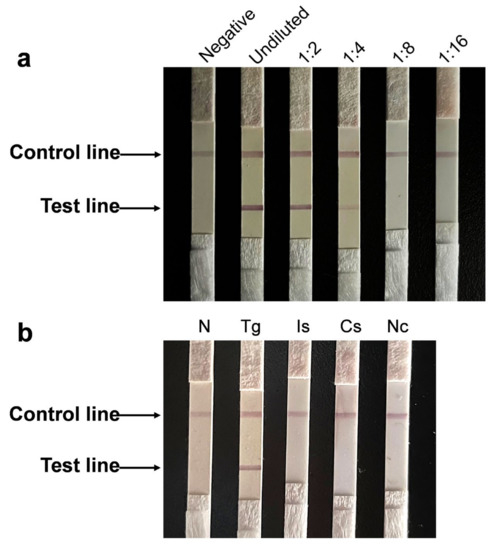 The sensitivity of the ICT was gauged by a series of 1:2 diluted T. gondii-positive porcine serum samples up to 1:16. Red color at the testing line was clearly observed when the sera were diluted to 1:4 (Figure 4a), indicating that the detection limit of the ICT was 1:4. The specificity of the ICT was verified with porcine serum samples positive for different pathogens that were often clinically observed. They included I. suis, C. suis, N. caninum, PRRSV, FMDV O-type, FMDV A-type and SFV. Two red lines were only observed with the T. gondii-positive porcine serum in the test and control zones. In contrast, only the control line appeared when each of the other sera were tested (Figure 4b and Figure S4). Furthermore, a red line was clearly observed in the test band exposed to positive porcine serum with the same batch of ICT strips stored at 4 °C for 12 weeks (data not shown), indicating that the test strips stored at 4 °C were stable for at least 12 weeks.