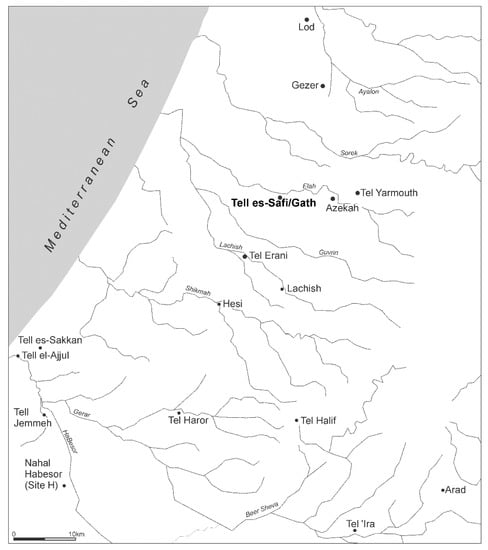 - Greenfield, H.J.; Shai, I.; Maeir, A.M. Understanding Early Bronze urban patterns from the perspective of an EB III commoner neighbourhood: The excavations at Tell eṣ-Ṣâfi/Gath, Israel. In Proceedings of the 9th International Congress on the Archaeology of the Ancient Near East, Basel, Switzerland, 9–13 June 2014; Stucky, R.A., Kaelin, O., Mathys, H.-P., Eds.; Harrassowitz Verlag: Wiesbaden, Germany, 2016; Volume 1, pp. 479–485. [Google Scholar]