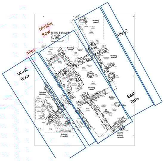 Three rectilinear rows of buildings were exposed in Area E at Tell eṣ-Ṣâfi/Gath (Figure 4). They are separated by a narrow street and gridded out on a NW to SE orientation. They are clearly part of a larger neighbourhood that encompasses much of the east end of the site, as the same orientation for building layout is found in excavations almost 100 m distant on the site [74].