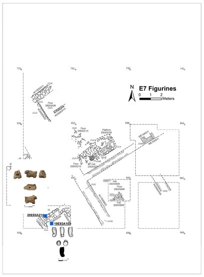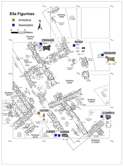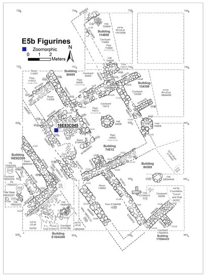 In the E5a Stratum, figurines are found across much of the excavation area and in a range of deposits, including walls, the alleyway, and in domestic deposits within buildings (Figure 14). Three are sheep-like, while the other three are only identifiable as zoomorphic. In Stratum E5b, an unidentifiable animal figurine fragment was found on a cobbled floor (144507) in an ancillary room (E15AQ09) of Building 74512 (Figure 15). In the E7 Stratum, the two examples were recovered from inside a wall (one sheep-like and one unidentifiable—Figure 16).